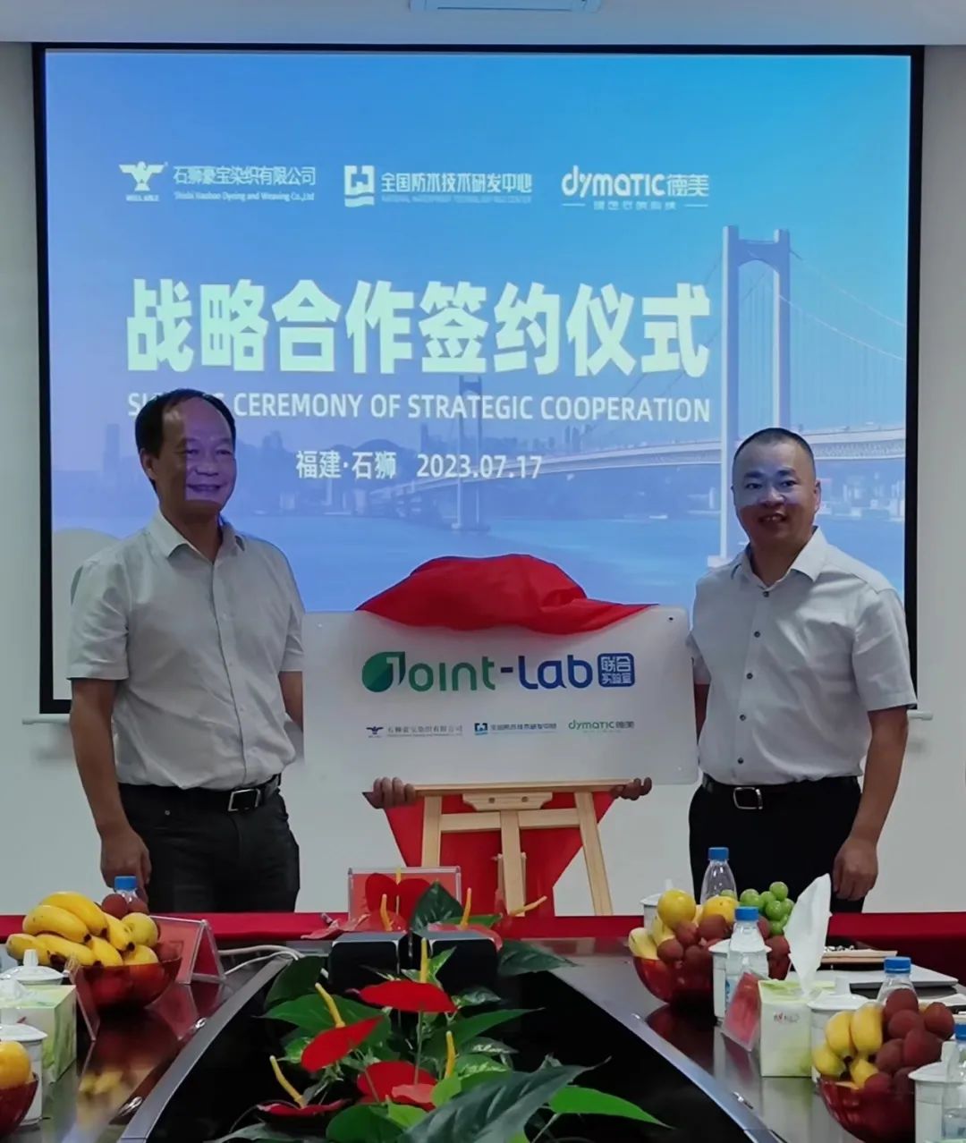 簽約現場 2023年7月17日,石獅市豪寶染織有限公司、全國防水技術研發中心和廣東德美精細化工集團股份有限公司三方簽署建立了防水聯合實驗室合作協議,此舉可以促進三方相互聯系與合作,推動紡織產業技術研發和提質增效。